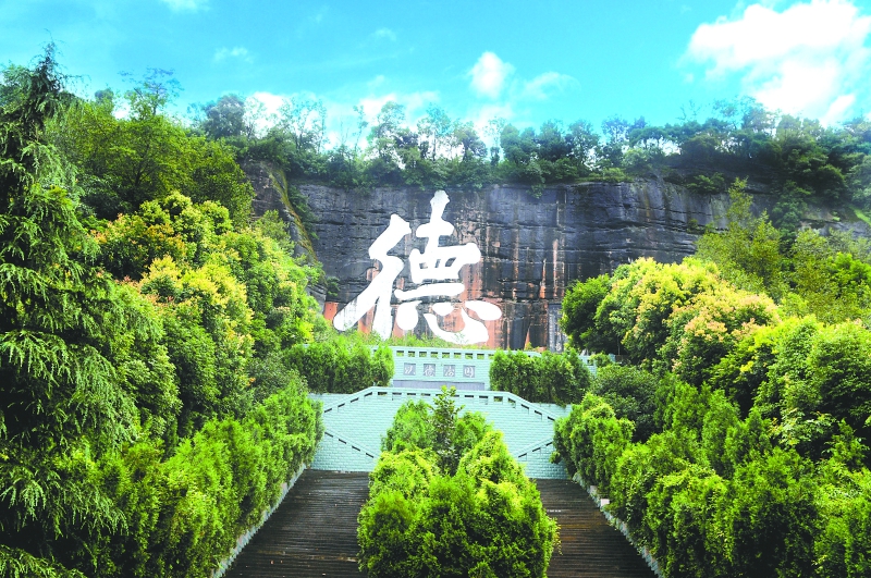 蕴含丰富“德”文化的景点在仪陇并不少见。位于金城镇禹宫社区的金粟书岩,上书巨幅“德”字,宽高各20米,数里外清晰可见。据了解,金粟书岩全长1200余米,在20米至28米高的陡峭崖壁上,排列有序地刻有伟人、名家的书法作品210余幅,真、草、隶、篆、行五法齐备。