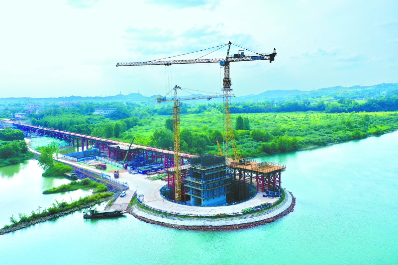 7月13日,在位于顺庆区搬罾街道的成达万高铁嘉陵江特大桥建设现场,施工人员战高温、抢进度,确保项目早日建成投用。南充日报社全媒体记者梁洪源摄